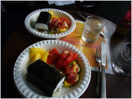 My favorite Hawaiian Lunch. Avocado and tomato salad. Pineapple. And Spam Musubi. And what is spam musubi. Well, a spam musubi is a block of plain (not vinegary; that would be sushi) rice with a slice of Spam (cooked or uncooked) on top, and wrapped up in nori (dried seaweed). I like to add a little dash of teriyaki.